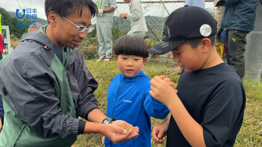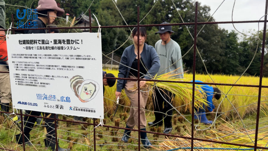 この日の稲刈りには、牡蠣を通して広島の里海を学んだ小中学生も参加。