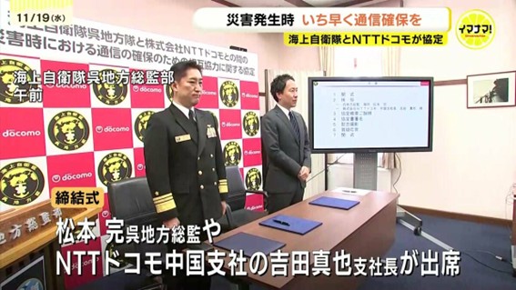 海上自衛隊呉地方隊とNTTドコモは、災害発生時に連携して通信の確保を行う協定を結びました。