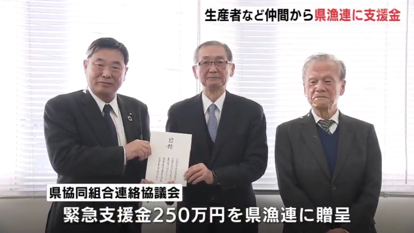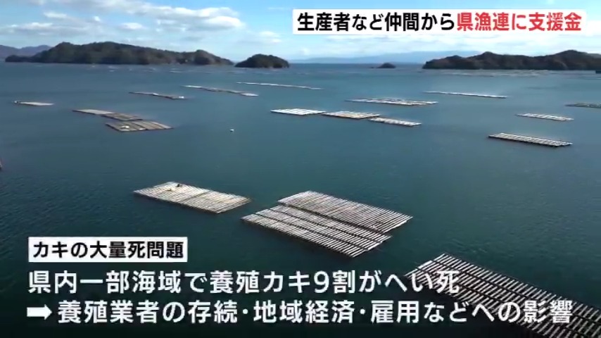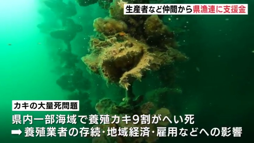 養殖カキの大量死を受け、26日、県漁連=広島県漁業協同組合連合会に緊急の支援金が贈呈されました。