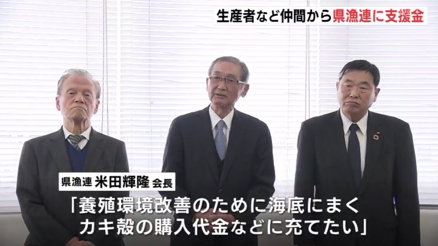 県漁連の米田輝隆会長は「養殖の環境を改善するために、海底に撒くカキ殻の購入代金などに充てたい」と話しました🦪🦪🦪